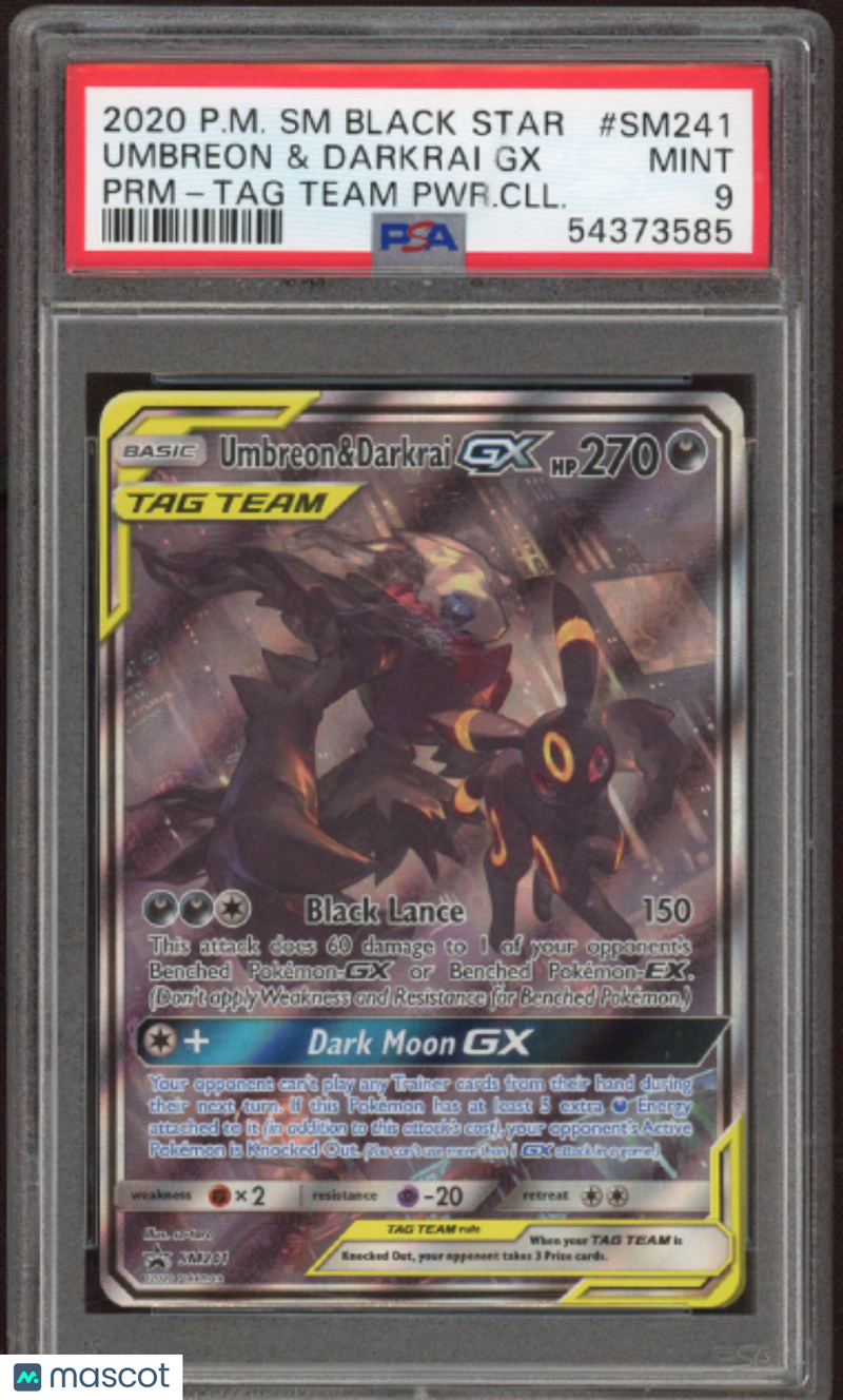 You are purchasing a 2020 Pokemon SM Black Star Promo Umbreon & Darkrai GX #SM241 PRM-TAG Team PWR.CLL. PSA 9. You will receive the exact item in the photographs. Thank you for looking. Listed With Mascot.
