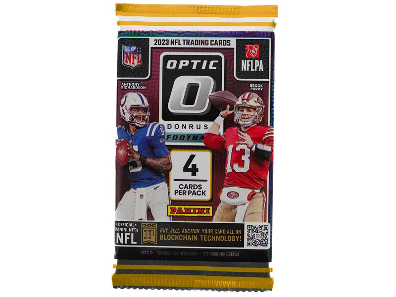 The flagship Donruss Football epically meets Optichrome technology with 2023 Panini Donruss Optic Football, a dynamic product featuring Donruss' trademark bells and whistles such as Rated Rookies, My House!, Downtown and more. Look for on-card autographs from this season's hottest rookies in Rated Rookies RPS Autographs. Donruss Optic Football boasts a robust parallel roster featuring must-chase versions such as Flex, Electricity, Jazz, Black Pandora and more.
