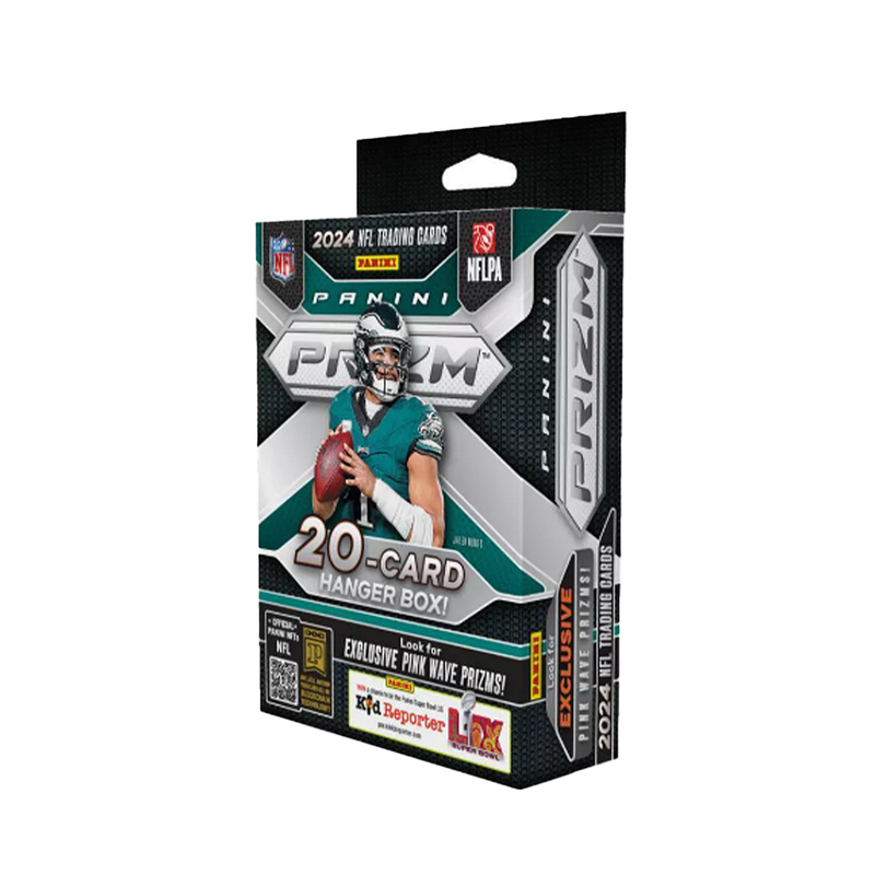 Panini presents the 2024 NFL Prizm Football Trading Card Hanger Box. Each box contain 20 cards. Look for Exclusive Pink Wave Prizms! All cards are randomly inserted across the production run and are not guaranteed in any individual pack, box or case.
