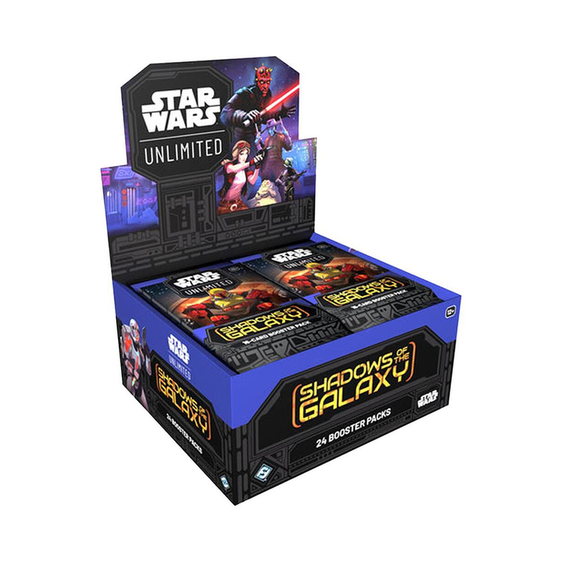 In this booster pack display for the game’s second set, Shadows of the Galaxy, players will find 24 individually wrapped booster packs. Each pack contains 9 common cards, 3 uncommon cards, 1 rare or legendary card, 1 leader, 1 base/token, and 1 foil card.