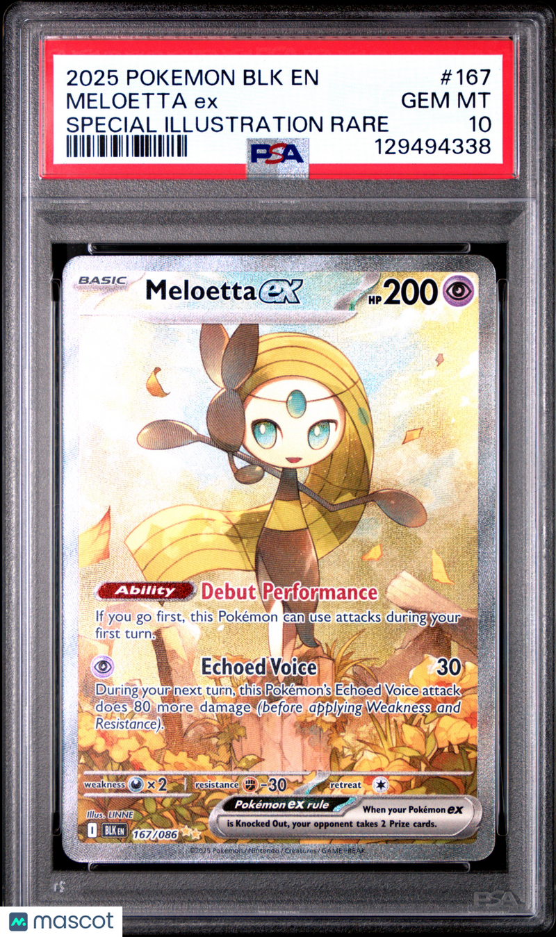 You are purchasing a 2025 Pokemon BLK EN-Black Bolt Meloetta EX #167 Special Illustration Rare PSA 10. You will receive the exact item in the photographs. Thank you for looking. Listed With Mascot.