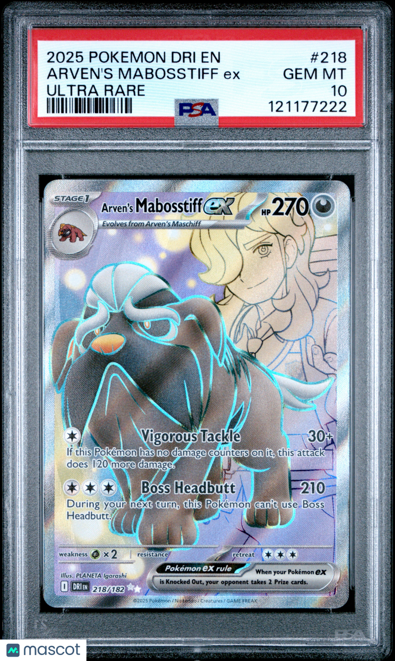 You are purchasing a 2025 Pokemon Dri EN-Destined Rivals Arven's Mabosstiff EX #218 Ultra Rare PSA 10. You will receive the exact item in the photographs. Thank you for looking. Listed With Mascot.