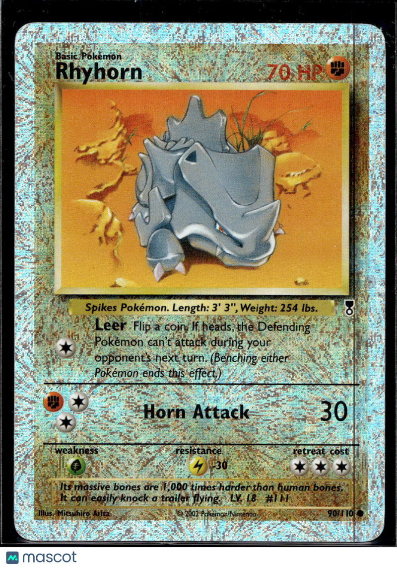 2002 Legendary Collection Rhyhorn #90/110 Add a classic to your collection with this Rhyhorn Reverse Holo from the 2002 Legendary Collection! This uncommon card, manufactured by Nintendo, features vibrant artwork and a unique reverse holo finish that stands out in any Pokemon TCG set. The card is in excellent, lightly played condition, making it a great choice for collectors and players alike. Don’t miss your chance to own this English-language Rhyhorn, card number 90/110, from one of the most sought-after Pokemon sets. This is a must-have for fans looking to complete their Legendary Collection or enhance their deck with a nostalgic favorite! Rarity: Uncommon Set: 2002 Legendary Collection Game: Pokemon Character: Rhyhorn Language: English Card Condition: Lightly Played (Excellent) Manufacturer: Nintendo Year Manufactured: 2002 Card Number: 90/110 Finish: Reverse Holo Listed With Mascot.