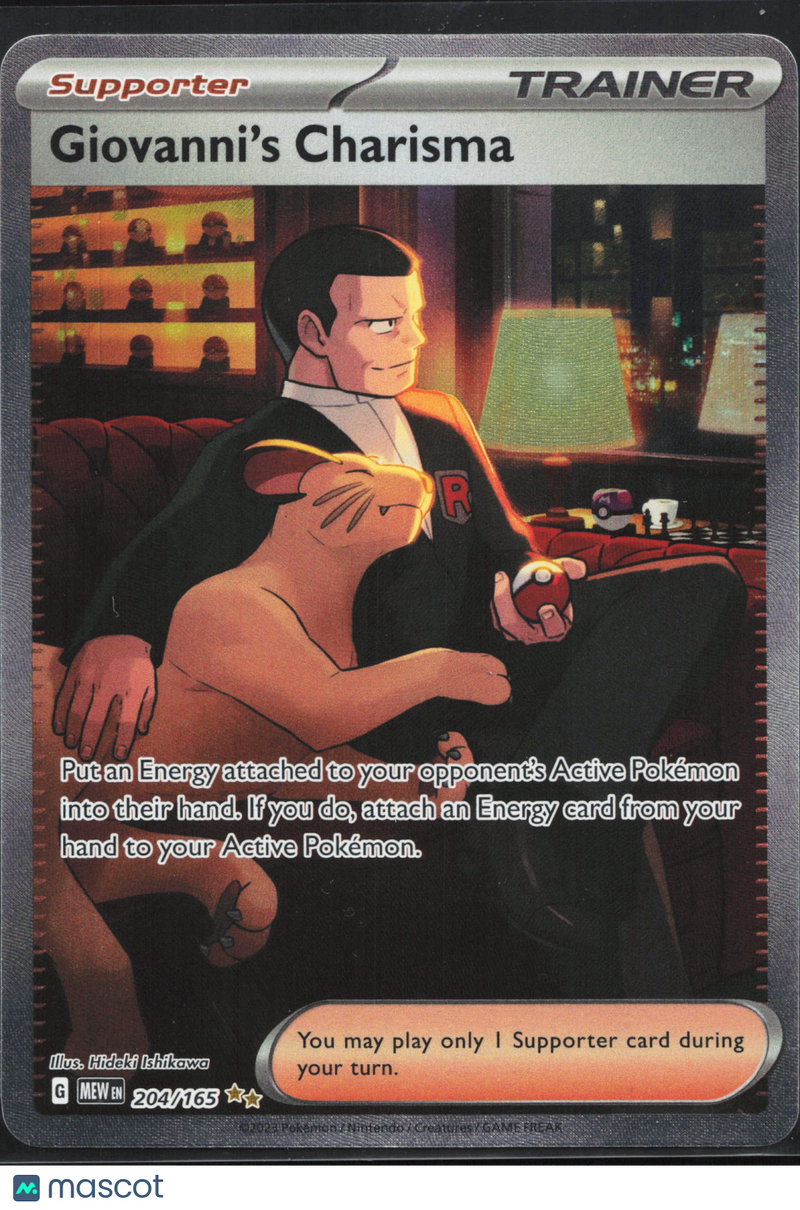 You are purchasing a 2023 Sv: Scarlet & Violet 151 Giovanni's Charisma #204/165. You will receive the exact item in the photographs. Thank you for looking. Listed With Mascot.