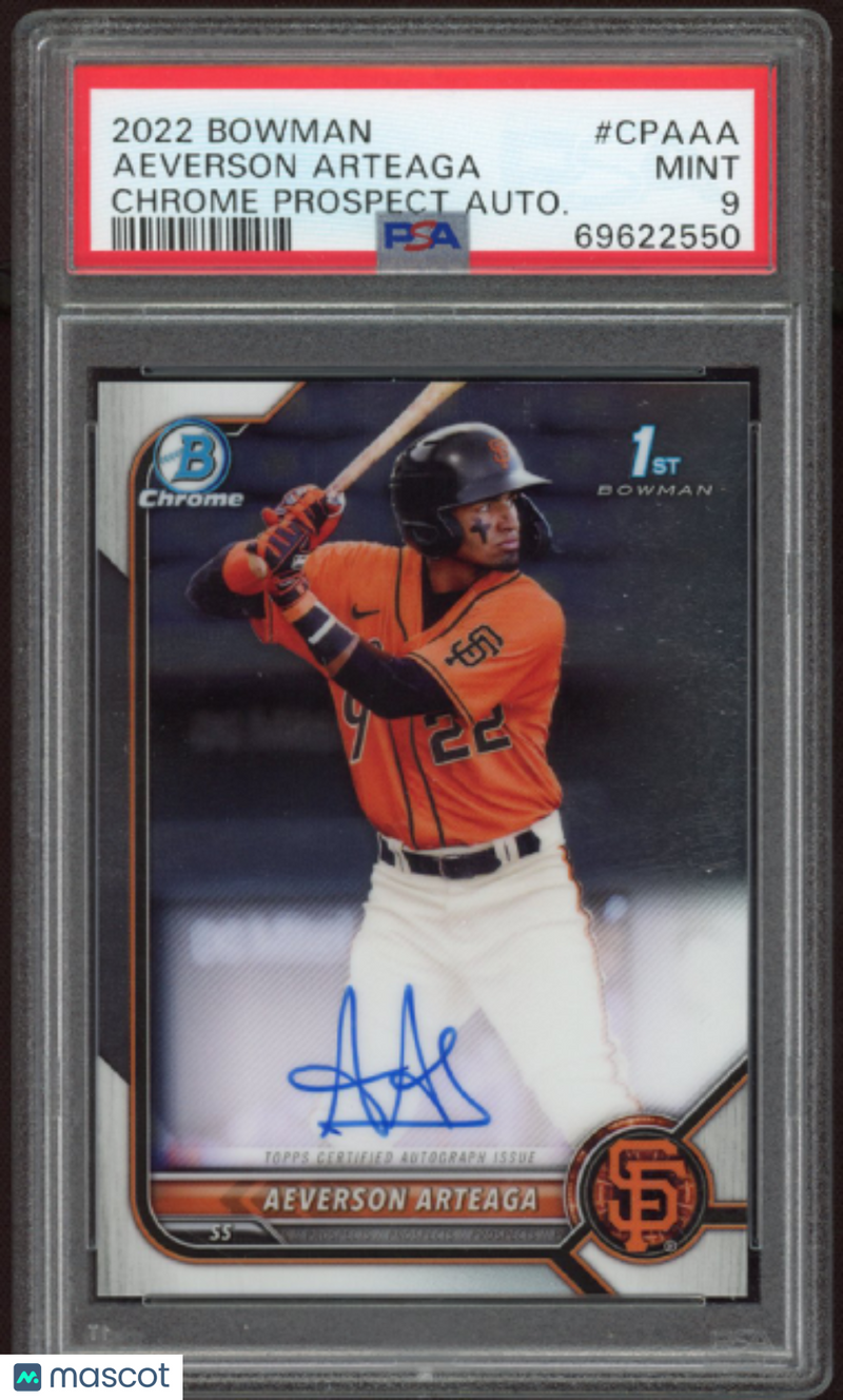You are purchasing a 2022 Bowman Chrome Prospect Autographs Aeverson Arteaga #CPAAA Autograph PSA 9. You will receive the exact item in the photographs. Thank you for looking. Listed With Mascot.