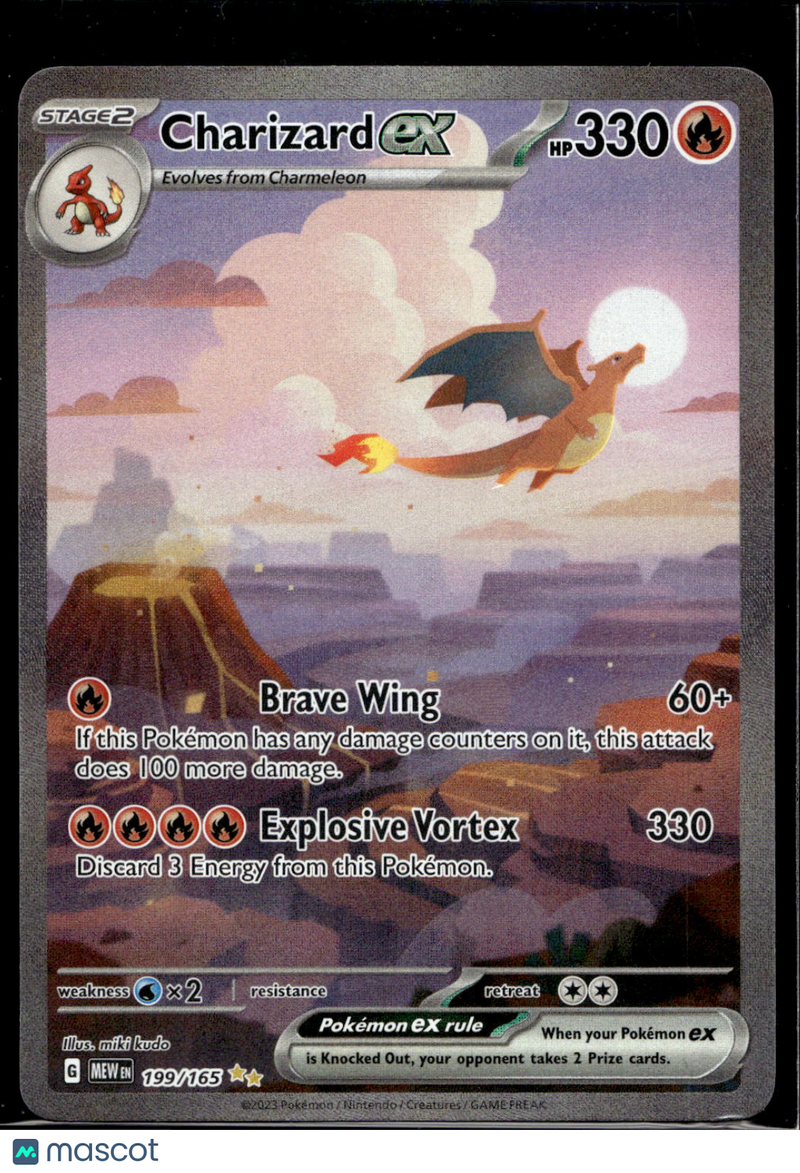 2023 Pokemon Scarlet & Violet Charizard EX #199/165 Don’t miss your chance to add the highly sought-after Charizard EX Secret Rare from the 2023 Pokemon Scarlet & Violet set to your collection! This English holo card, manufactured by Nintendo, is in excellent lightly played condition and features the iconic Charizard in stunning detail—a must-have for collectors and players alike. With its Secret Rare status and brilliant holo finish, this Charizard EX stands out as one of the most desirable cards from the set. Secure this impressive card today and elevate your Pokemon TCG collection with a true fan favorite! Rarity: Secret Rare Set: 2023 Pokemon Scarlet & Violet Game: Pokemon Character: Charizard EX Language: English Card Condition: Lightly Played (Excellent) Manufacturer: Nintendo Year Manufactured: 2023 Card Number: 199/165 Finish: Holo Listed With Mascot.