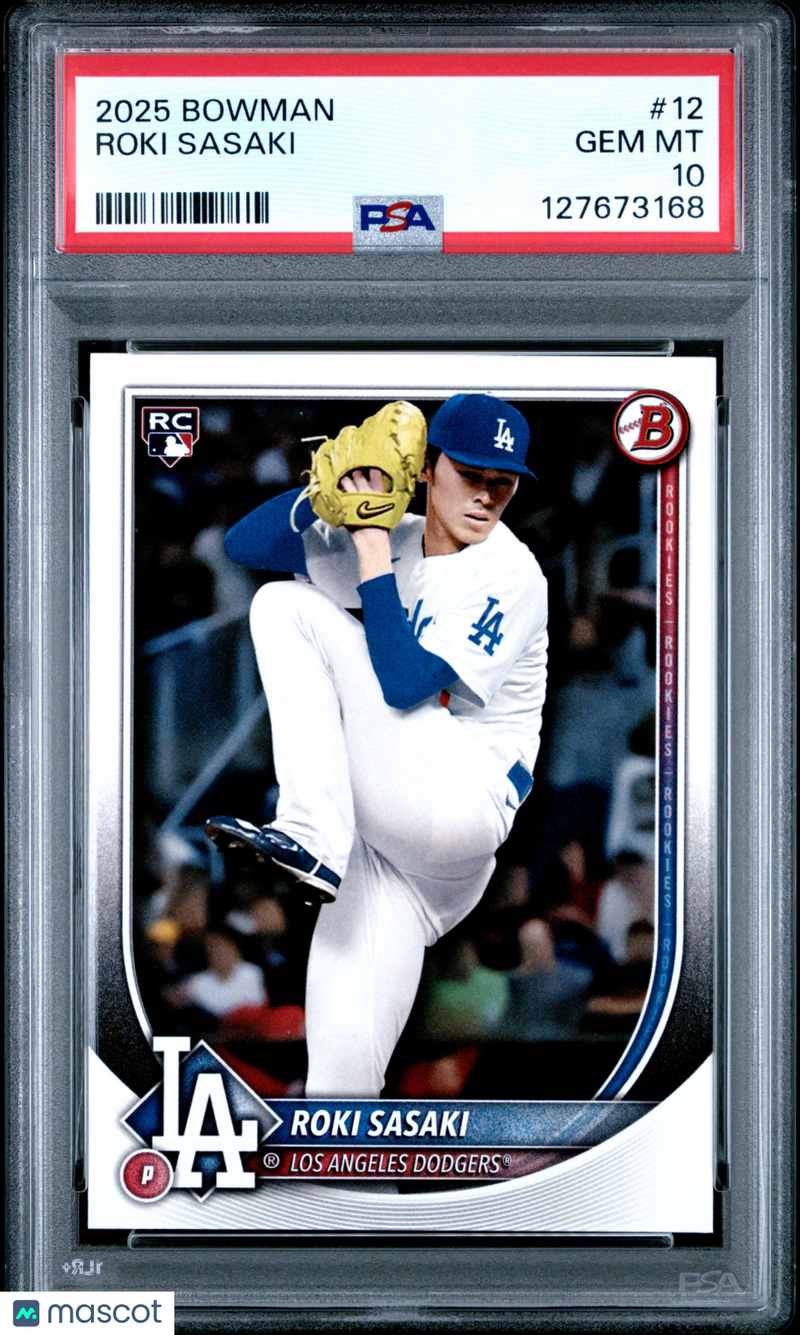 You are purchasing a 2025 Bowman Roki Sasaki #12 PSA 10. You will receive the exact item in the photographs. Thank you for looking. Listed With Mascot.