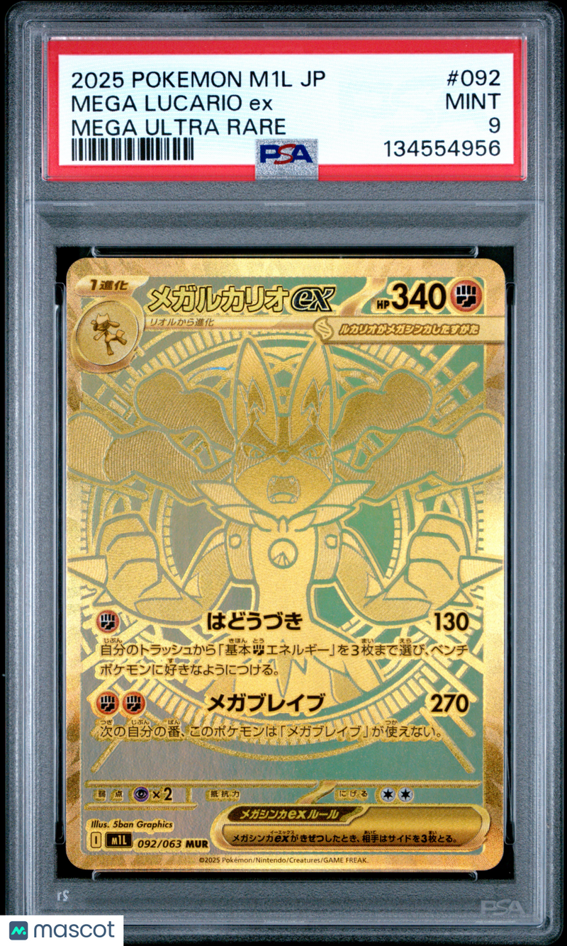 You are purchasing a 2025 Pokemon Japanese M1L-Mega Brave Mega Lucario EX #092 Japanese Mega Ultra Rare PSA 9. You will receive the exact item in the photographs. Thank you for looking. Listed With Mascot.