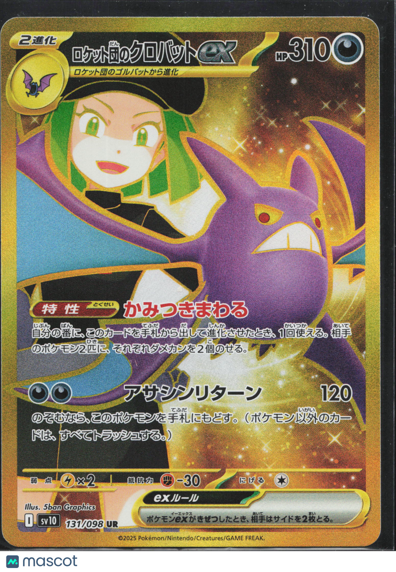 You are purchasing a 2025 Pokemon Scarlet & Violet Destined Rival Team Rocket's Crobat EX #131/098 UR Japanese UR. You will receive the exact item in the photographs. Thank you for looking. Listed With Mascot.